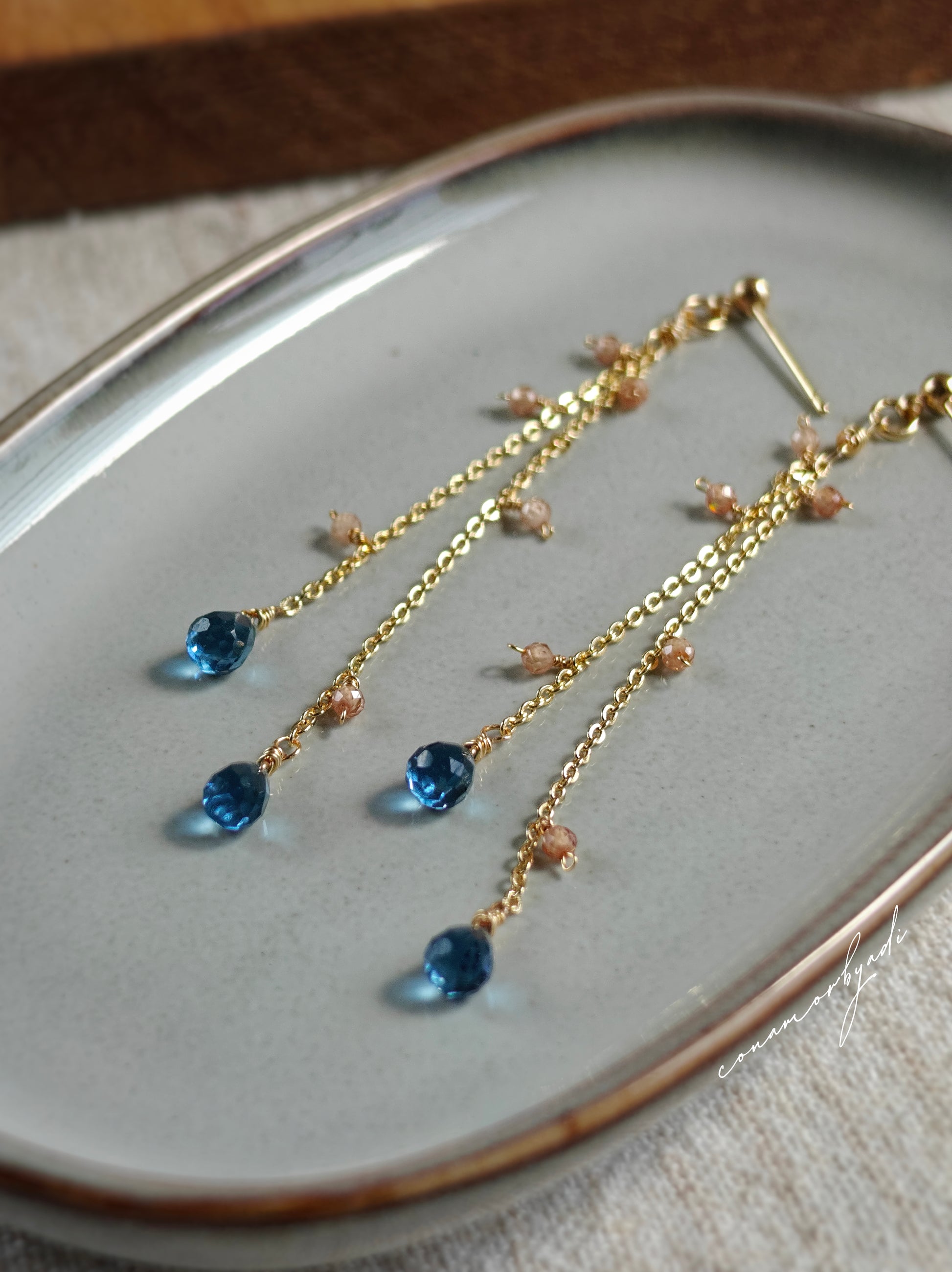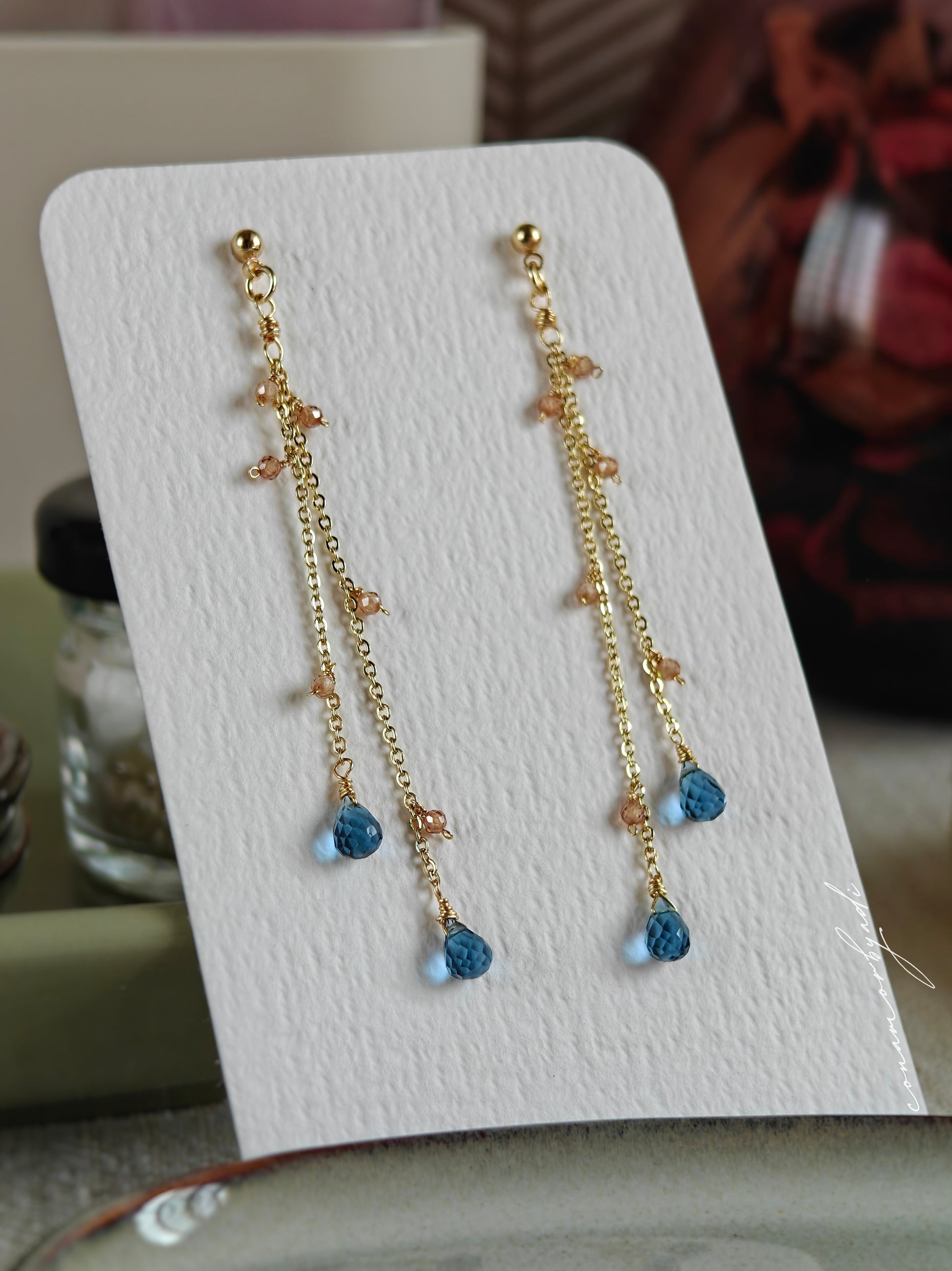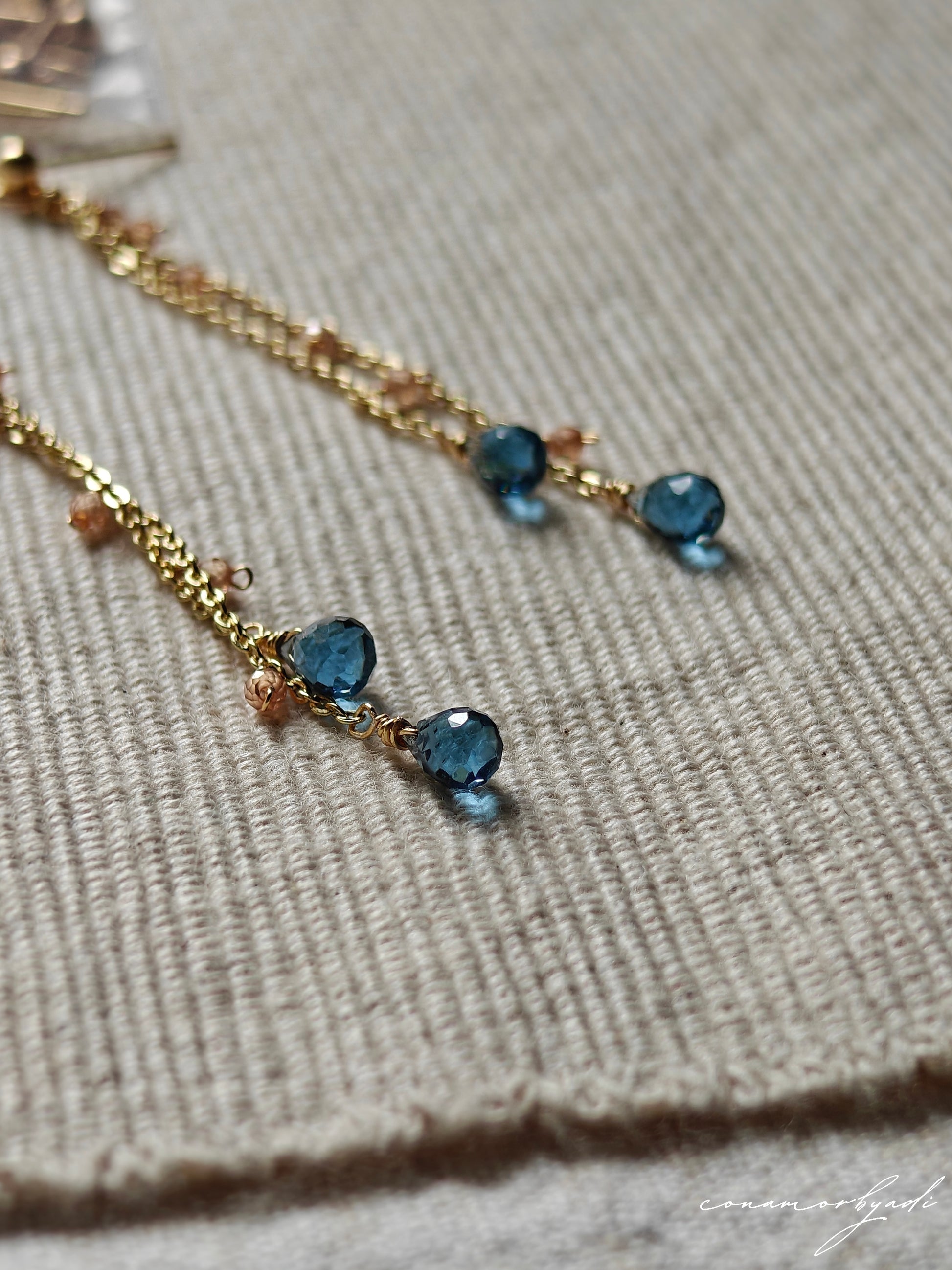 Designed using hypoallergenic 14k gold-plated chain and wire, Safira is adorned with natural London blue topaz gemstones, chosen for their serene depth and timeless elegance. Feather-light and exquisitely delicate, it is the lightest piece in our collection.