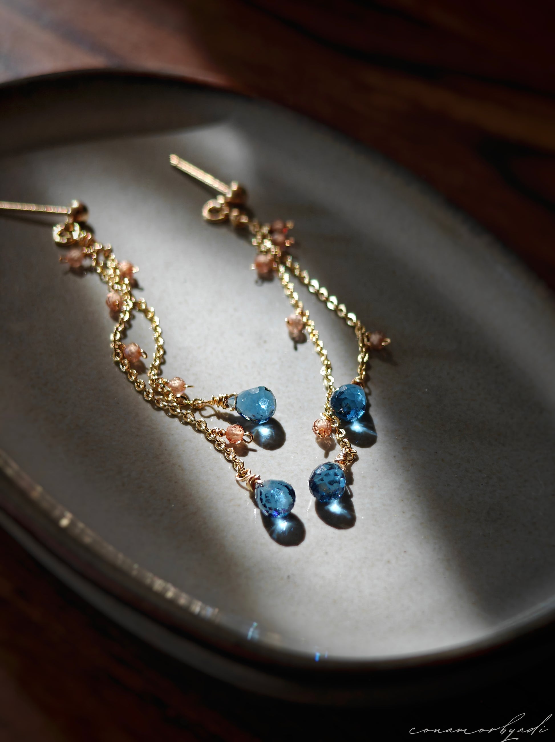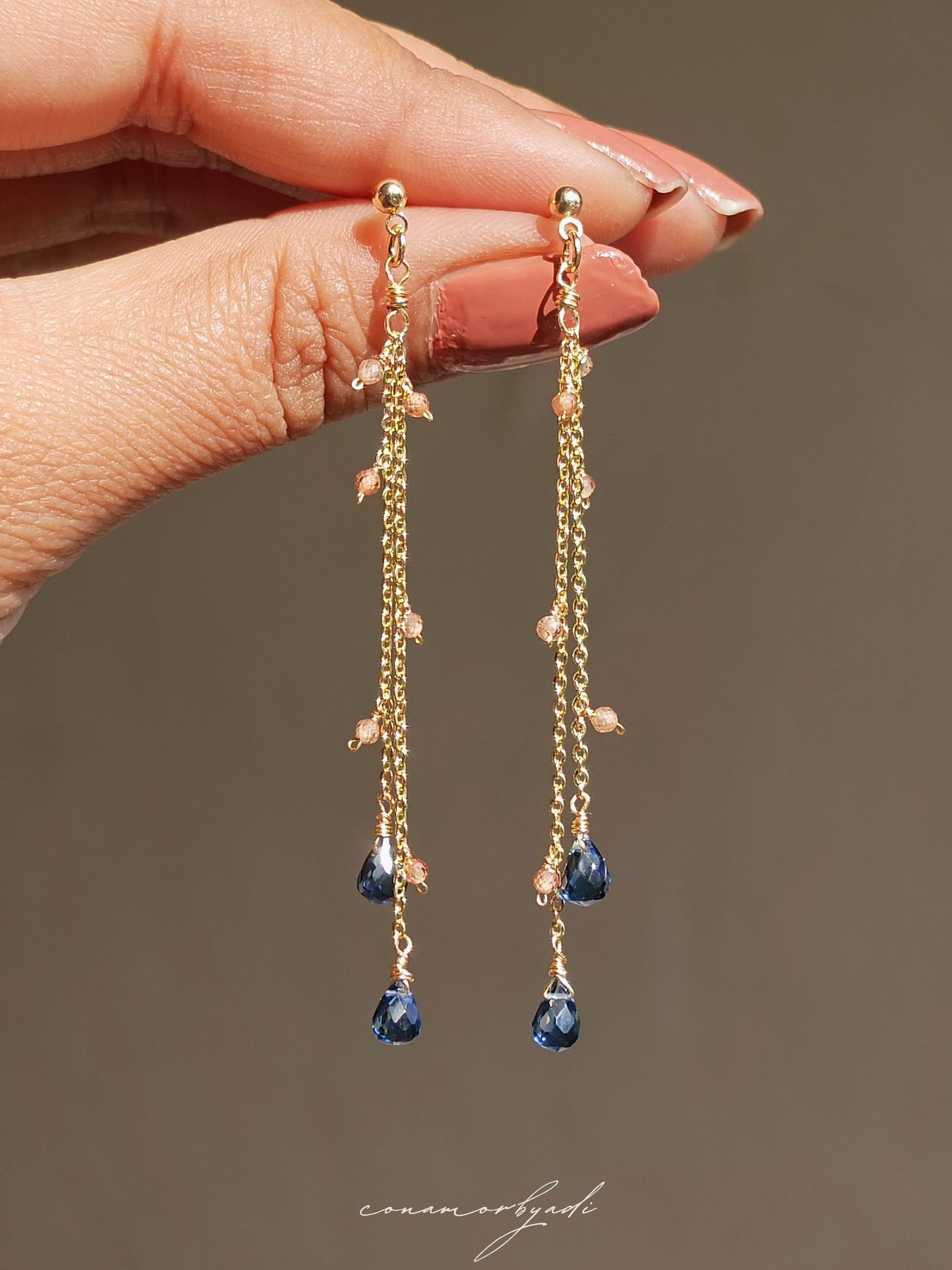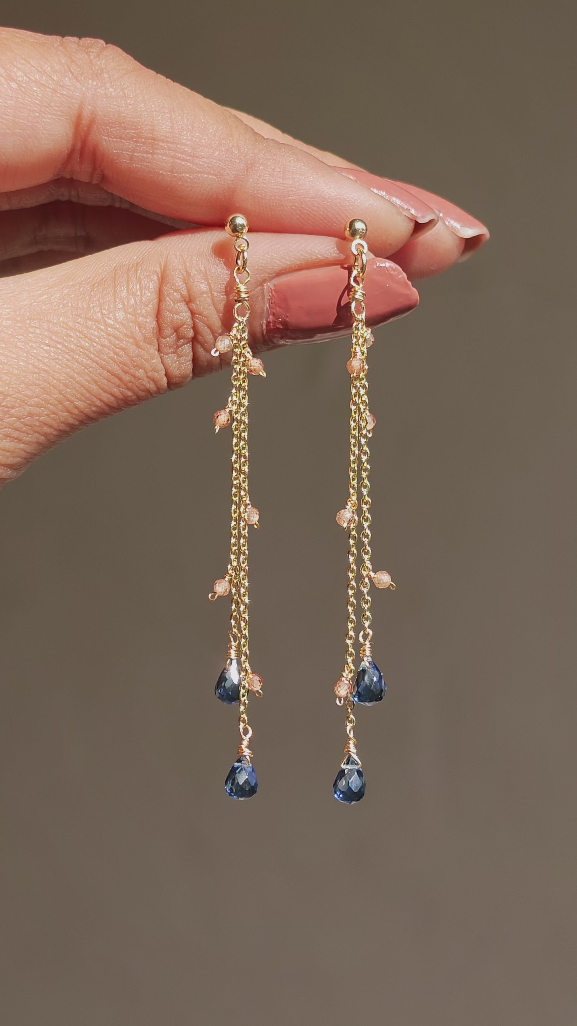 Designed using hypoallergenic 14k gold-plated chain and wire, Safira is adorned with natural London blue topaz gemstones, chosen for their serene depth and timeless elegance. Feather-light and exquisitely delicate, it is the lightest piece in our collection.